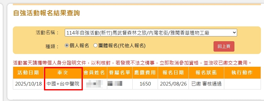 * 提醒『當日參加人員請備妥身分證明文件,因涉及個人平安保險權益,請勿冒名頂替,經查核屬實 需全額付費且不退預繳費用』。